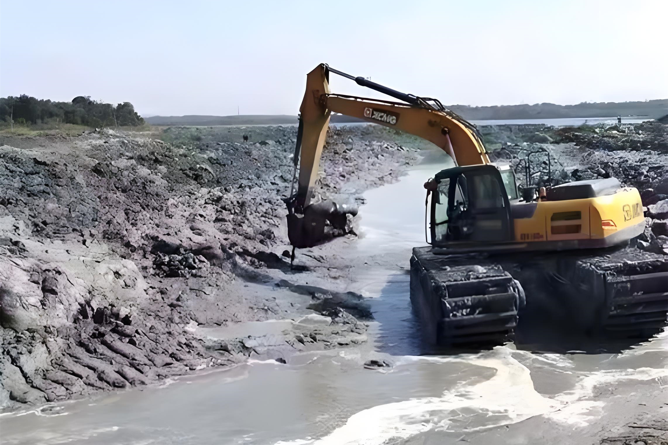 對于流塑狀淤泥(用手抓會從指縫溜走),長臂挖機的優(yōu)勢更明顯。這種淤泥承載力極差,挖機一旦陷入很難脫困,長臂挖機可以 “遠程作業(yè)”,用鏟斗將淤泥扒到岸邊,減少設備與淤泥的直接接觸。同時,長臂的 “杠桿效應” 能更輕松地攪動深層淤泥,配合泥漿泵將其抽排出去。